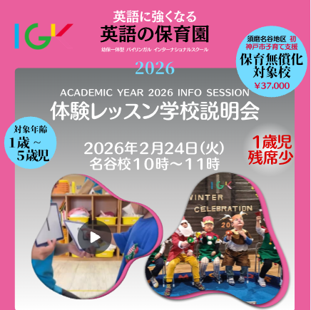 2025/08/20 2026年度新入園児 体験入園&説明会のご案内 / 2026年2月1日 更新 IGKではこれから入園を控えるご家族様向けの 「体験入園&説明会」を開催いたします。 開催日時:2026年2月24日(火)10時ー11時 *1歳児クラスの残席は残り僅かとなっております。 実際に英語環境の中で活き活きと活動をする可… Read more